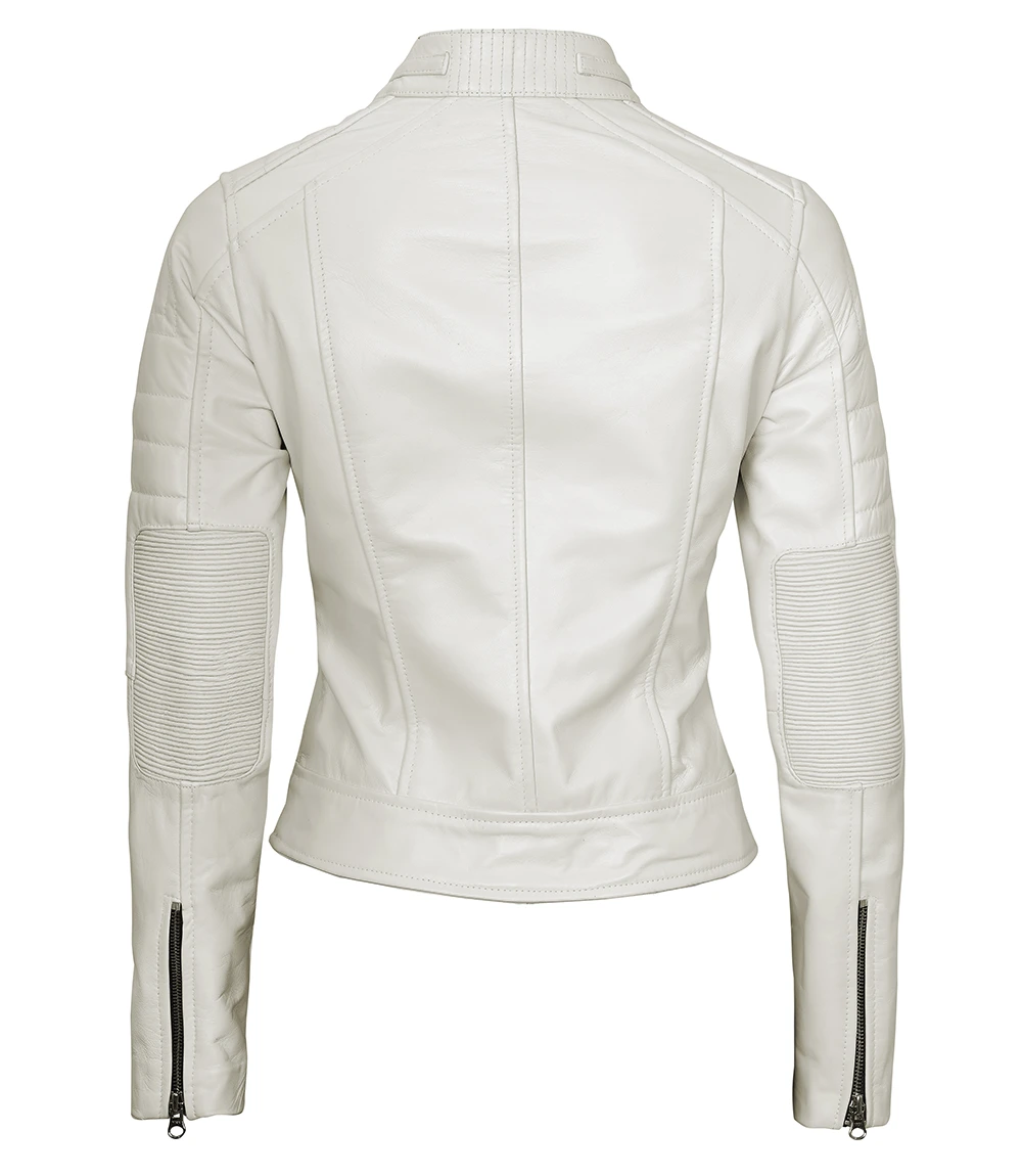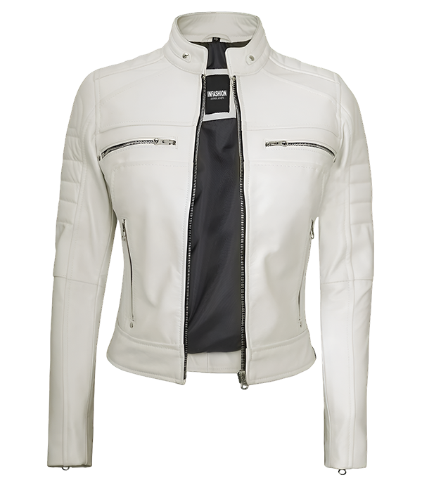 Our Austin Women’s Off White Cafe Racer Biker Jacket! Made from supple lambskin is all about effortless cool. The sleek design and perfect fit make it your new go-to for any occasion.