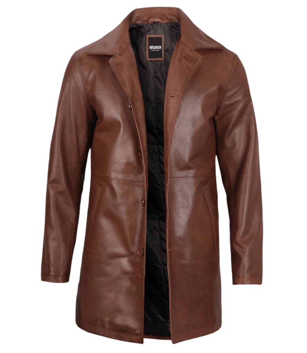 Tan Men’s Distressed 34 Length Leather Car Coat